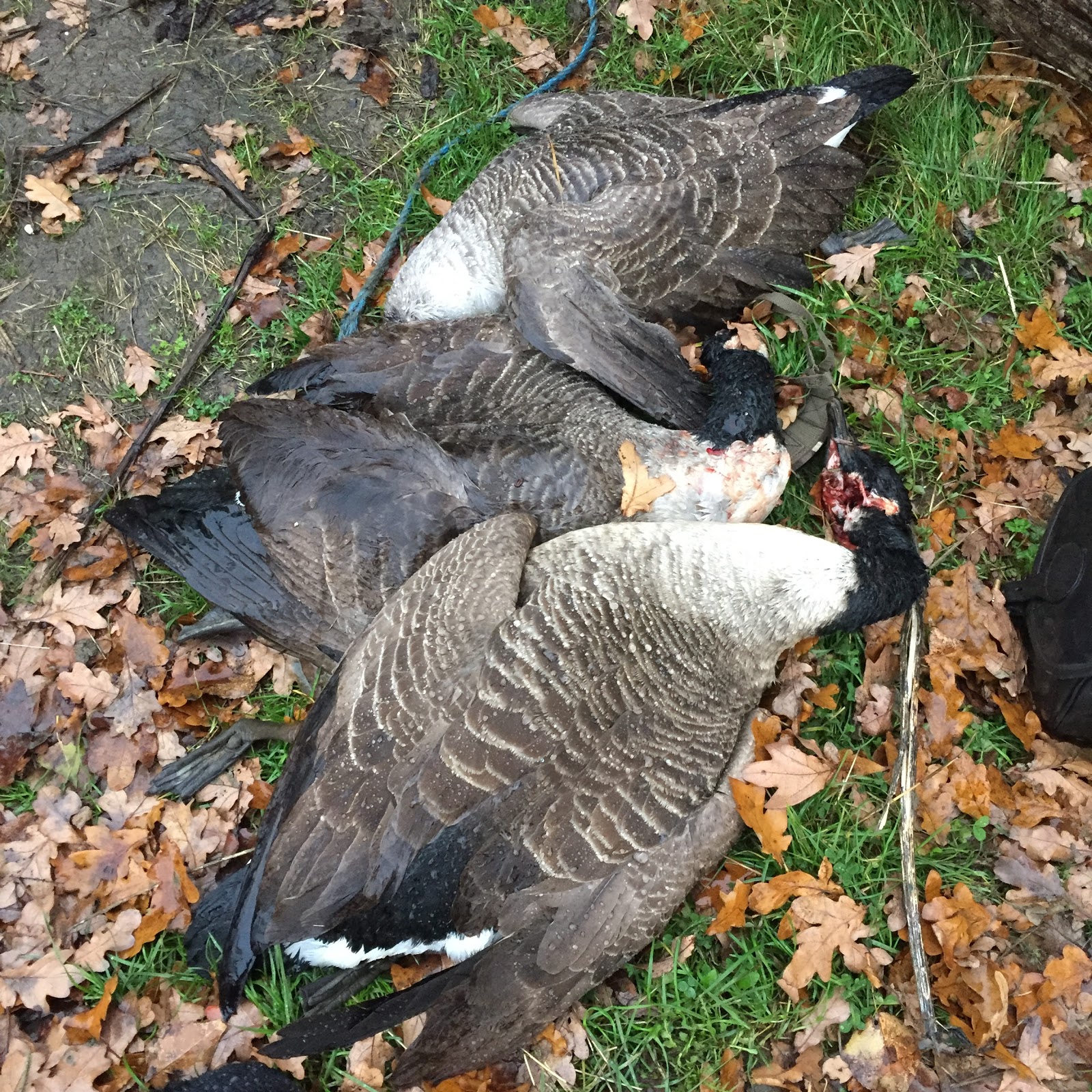 Dawn has now fully broken and the rain lessens. To my consternation a goose wanders over, on foot. I'm nearest so I walk over and shoot him. A few feathers become airborne, he looks at me quizzically, I shoot him again, seemingly without affect. Click, as I'm reloading he expires.