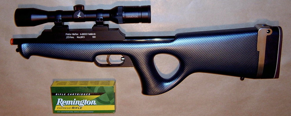 Pfeifer-Waffen SR3Rarer than a vegan boyfriend riding a Unicorn. The 'so short you don't need to take it down' offering. A single-shot rifle with a barrel length of 66 cm and an overall length of 70 cm.Pfeifer really do plough their own furrow, with a whole host of innovations in a rifle designed for mountain stalking in the Alps. The reversed trigger cocks the rifle, the button is the trigger. Using hammer forged barrel by Heym. Chambered from .22LR to .458. Aluminium action for .22 to 6 x 70R, steel for the bigger ones.