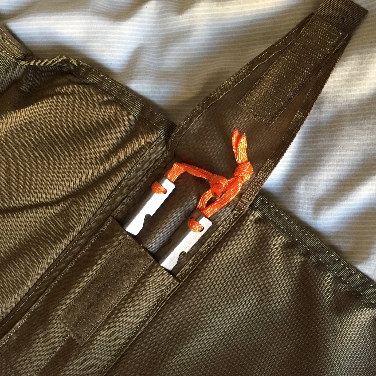 There are pockets for your tent pegs; so you can keep the matt flat. Obviously I could have used any old tent pegs from the gear pile, but I've ordered some poncey titanium ones to keep in with the lightweight theme.